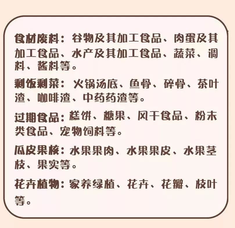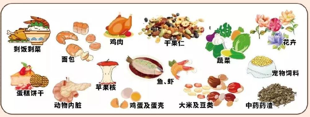 易腐的生物质生活废弃物。易腐垃圾应从产生时就与其他品种垃圾分开收集。投放前尽量沥干水分,有外包装的应去除外包装投放。