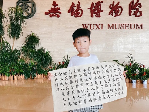 书法是中国特有的一门传统艺术,也是最具有经典标志的民族符号。书法在技法上讲究执笔、用笔、点画、结构、墨法、章法等,与中国传统绘画、篆刻关系密切。中国的书法在创造伊始,就在实用之外,走向了艺术美的方向。在本次书法体验活动中,老师为大家介绍了执笔方法的演变,示范了“五指执笔法”。在老师的指导下,每位同学都体验书写了《水调歌头》。现场的“小书法家们”十分投入,一笔一划认真描红。在点画之间,不同的字形显现出不同的气质,酷暑的炎热在这里似乎因心神安静而清凉了不少。一个半小时的活动时间里,孩子们在墨香中感受到了书法艺术的博大精深,体验着书法文化的美好与乐趣。