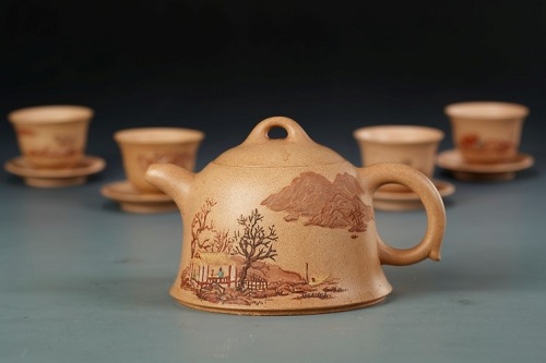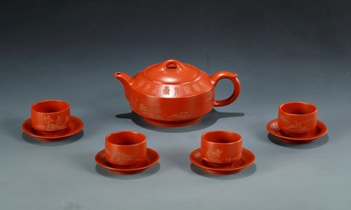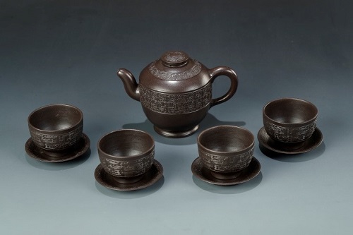 路朔良大师此次捐赠紫砂作品中的玉垆壶取法宋代宫廷所用玉垆造型,以黑朱泥老料精制而成,壶身纹饰吸取了商周青铜器元素特点,夔龙纹、几何纹等纹饰层次丰富、疏朗有致,极具高古之气。又如堆彩山水汉钟壶一套九件,每件作品堆绘一形一图,图景取意宋人,以渔、樵、耕、读、琴、棋、书、画、亭、台、楼、阁等组合成不同形式的山水意境,整体纹饰雅致清新,色彩悦目,传达出匠心精致的表现力,为路朔良大师的经典之作。