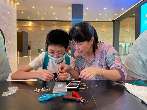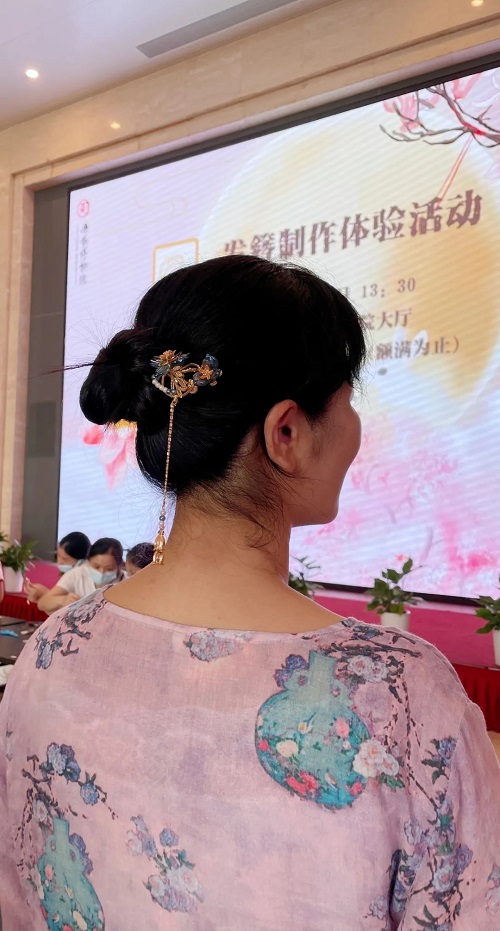 9月20日,我们邀请古风爱好者们一起亲手制作一支发簪。在老师的指导下,大家很快学会了如何用金属丝缠绕制作花瓣和花蕊的方法,再用琉璃花瓣和珍珠镶嵌点缀,一支精巧雅致的发簪便于手中悄然绽放。可别小看这一缠一绕,看似简单却也考验人的耐心和细心,如何搭配取舍,如何整理造型都需要费一番心思。明月清晖,宝髻瑶簪,当我们把亲手制作做的发簪插于鬓发间时,点染出的,是一个充满东方古典神韵的别样中秋。