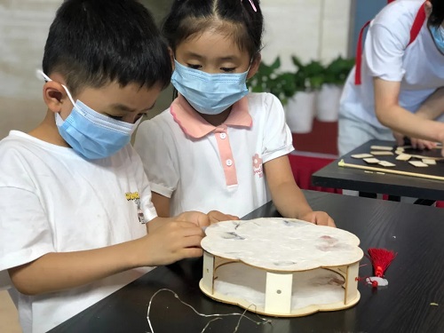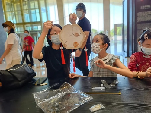 在中秋节当天,无博物院也开展了“华灯伴月——花灯制作体验活动”。现场30组亲子家庭一起制作了一盏属于自己的花草纸灯笼。孩子们在家长的协助下,将花灯片片拼接完整。每一盏花草灯都有其独特的图纹,纸张精粝,纹路起伏,呈现出特有的古朴之美。将其横挂在短杆上,打开灯串,彩光透过宣纸闪耀,汇聚成璀璨星河。在这个浪漫唯美的中秋夜,手持花灯在月下游嬉玩耍,定能为中秋增添一景。